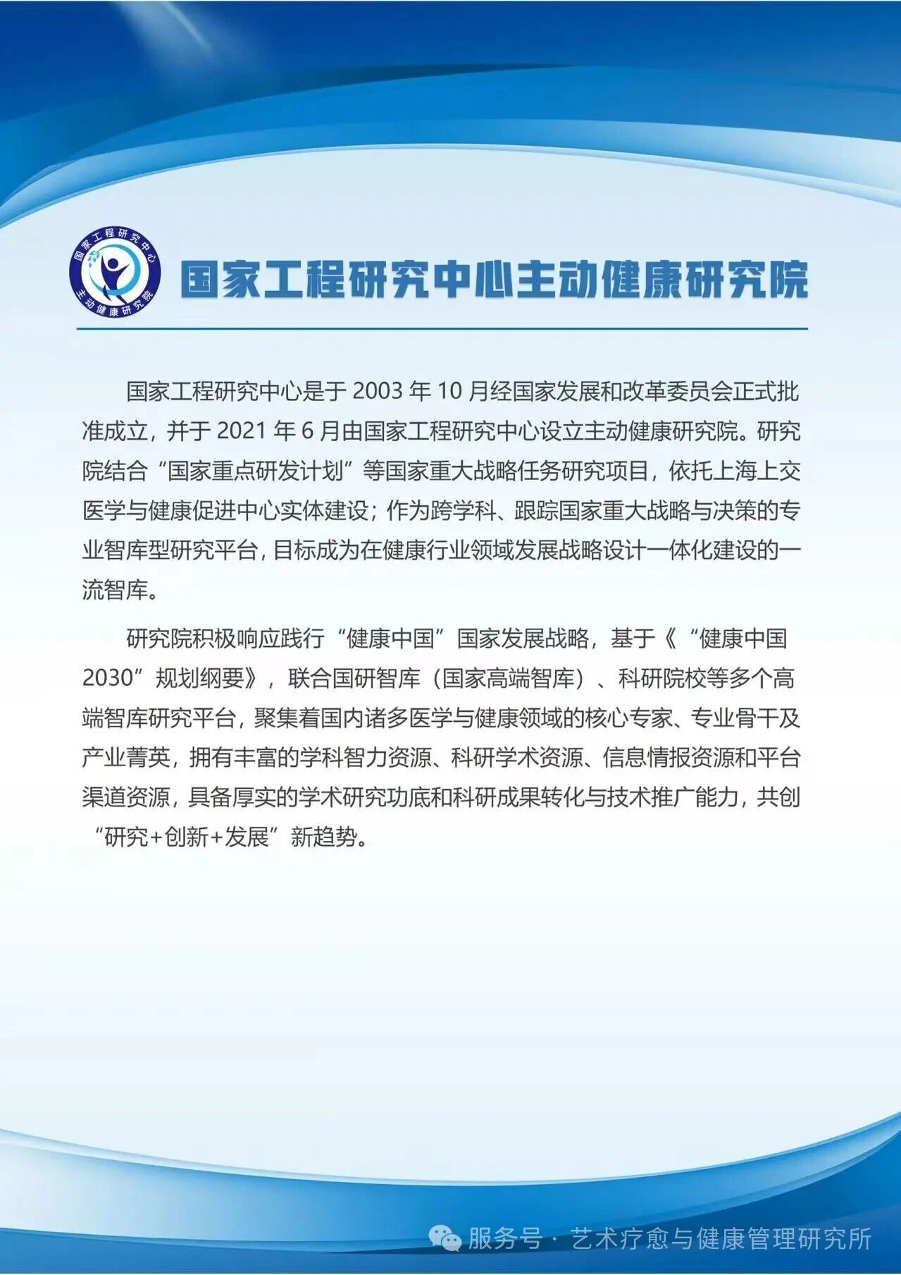 国家工程研究中心主动健康研究院艺术疗愈与健康管理研究所是由上海市高等教育学会国际交流专业委员会、上海市青少年发展基金会青少年美育培育专项基金、上海司鹤羽教育科技有限公司共同发起,依托国家工程研究中心主动健康研究院联合成立的专业机构。